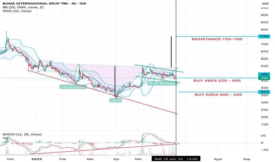 BUY AREA : Area yang dapat dijadikan area beli bisa dilakukan pada 520 - 400. Namun untuk profile resiko yang lebih konservatif, dapat menunggu terjadinya breakout pattern head and shouldersnya, lalu menunggu jika harga berkonsolidasi di area MA20 pada rentang waktu 4H.