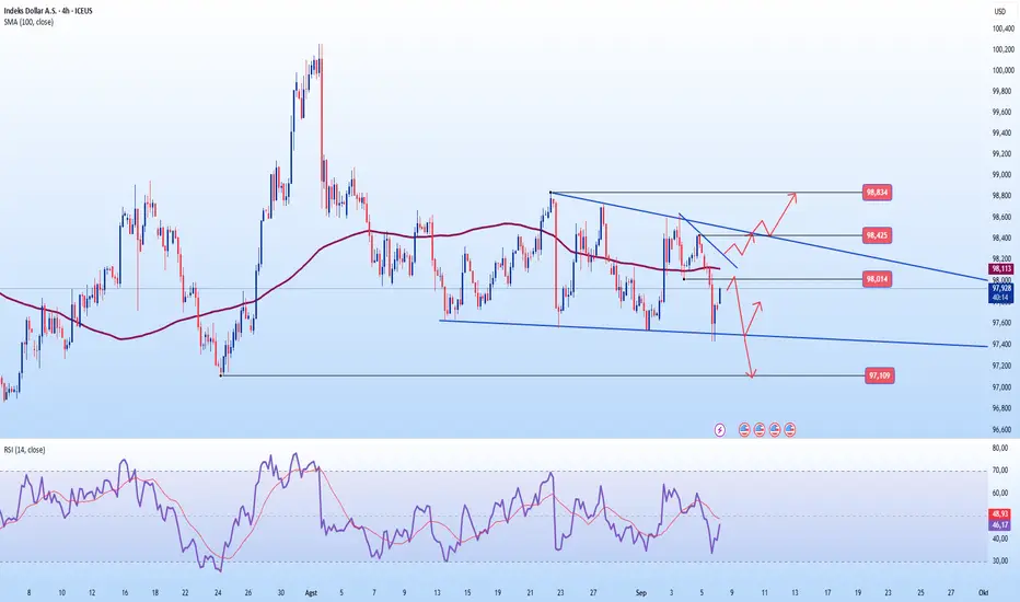 Jika harga gagal bertahan di atas 98.000 dan breakdown ke bawah 97.919 → peluang uji 97.400 – 97.109 cukup kuat. Break di bawah 97.100 dapat melanjutkan tren turun lebih dalam.