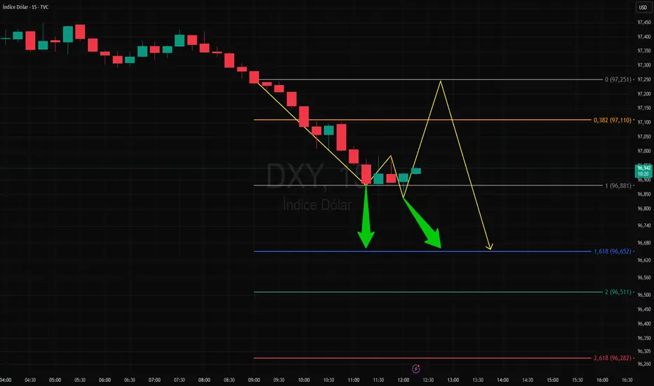 No gráfico de 5 minutos da DXY, rompeu um pivô de baixa indicando a busca do(s) alvo(s) da projeção de Fibonacci, poderá retrair gerando um trade com retorno/risco mais favorável.