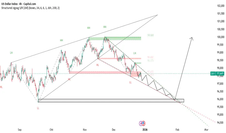 Indeks Dolar AS (DXY) saat ini bergerak dalam struktur koreksi menurun, ditandai dengan perubahan dari higher high menjadi lower high dan lower low, yang menunjukkan tekanan bearish jangka pendek. Harga sedang mendekati zona support struktural utama di bagian bawah channel, di mana momentum jual mulai melemah dan terjadi kompresi harga. Area ini menjadi titik krusial: pantulan (reversal sementara) berpotensi terjadi jika buyer mampu mempertahankan support dan memicu perubahan struktur, sehingga membuka peluang penguatan kembali menuju area supply sebelumnya. Namun, jika support ini ditembus secara valid, maka DXY berpotensi melanjutkan penurunan mengikuti tren korektif yang sedang berlangsung.