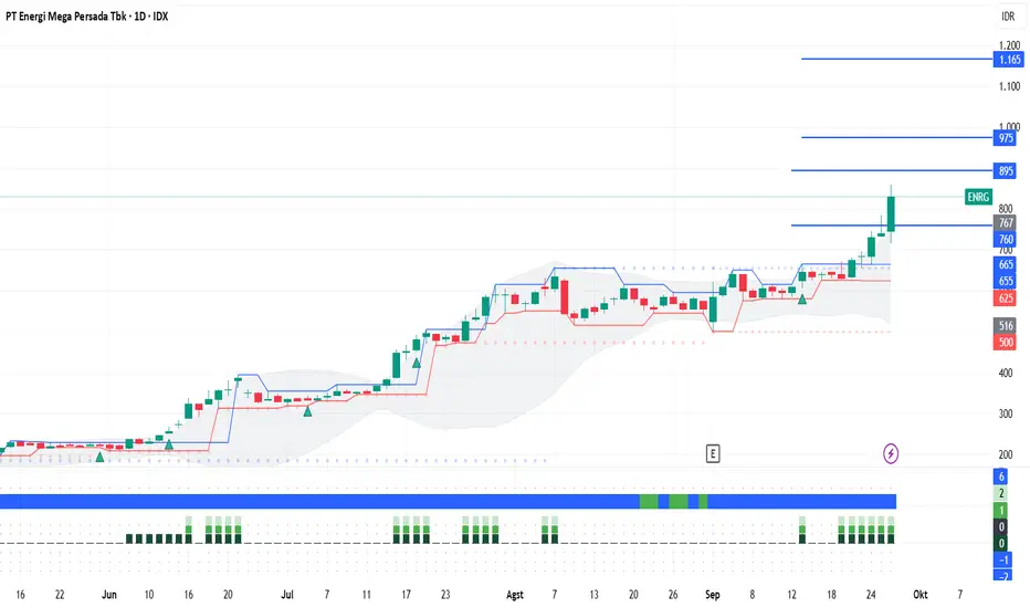 Sesuai dengan ulasan ENRG sebelumnya: 'ENRG: Masih Ada Peluang ke 895' saham ini berhasil naik dan hampir mencapai target major kami di 895. Bagaimana peluang ENRG kedepannya? Kenaikan tajam yang terjadi di ENRG hari ini membuka peluang saham ini mengalami technical correction sementara. Namun, selama pergerakannya mampu bertahan di area 760, koreksinya masih cenderung sehat. Target kenaikan ENRG selanjutnya berada di area 1165 dengan minor target di 975. Trend optimizer yang bewarna biru solid juga menunjukan saham ini berada di fase strong uptrend.