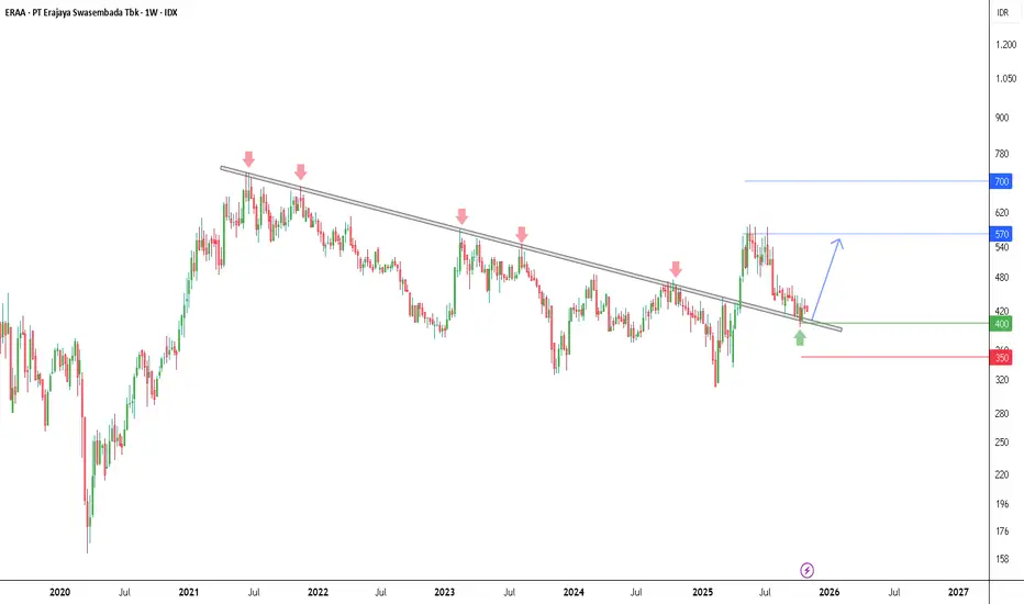 Kesimpulannya, saat ini ERAA berada pada fase Golden Retest yang sangat krusial, berpotensi memulai major uptrend baru setelah terkoreksi dalam waktu yang lama. Selama level 400 (area retest) mampu dipertahankan dan tidak terjadi penutupan weekly candle di bawah 350 (SL), maka peluang harga untuk rally menuju 570 dan berlanjut ke 700 tetap ada.