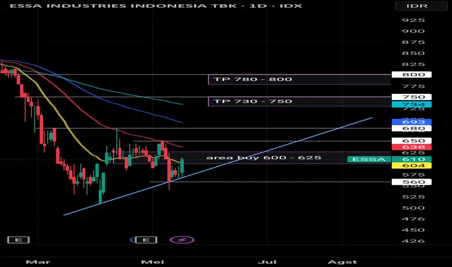 ESSA berada di awal kenaikan dan di ikuti dengan kenaikan volume buy. Jika ESSA mampu breakout dari harga 650, ESSA bisa berpeluang naik menuju TP1 730-750 lalu lanjut naik TP2 780-800. Selama ESSA masih bisa bertahan diatas garis trend line dan tidak breakdown dibawah support 560 peluang ESSA naik masih ada.