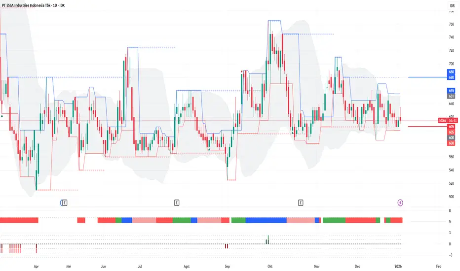 2. Kini bergerak di range 605 yang bertindak sebagi swing low hingga 680 yang bertindak sebagai swing high.
