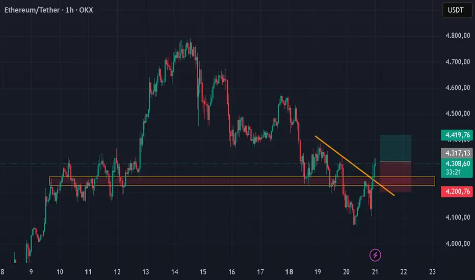 ETHUSDT H1 : Modal Zona Konsolidasi dan Trendline, di timeframe H1 saya menemukan zona konsolidasi yang menarik dikonfirmasi dengan break trend line dan juga candle price action.