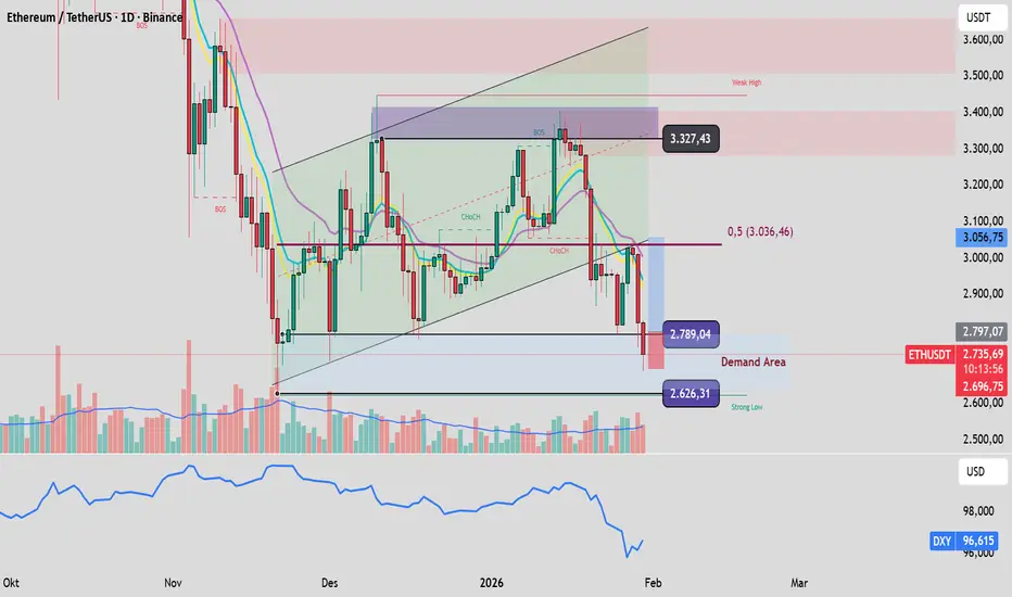 Ethereum saat ini sedang testing Demand Area. Jika level $2.626 (Strong Low) jebol, ada risiko harga meluncur ke area support yang lebih rendah (kisaran $2.400 - $2.500). Namun, dengan DXY yang melemah, peluang untuk technical rebound cukup terbuka lebar.