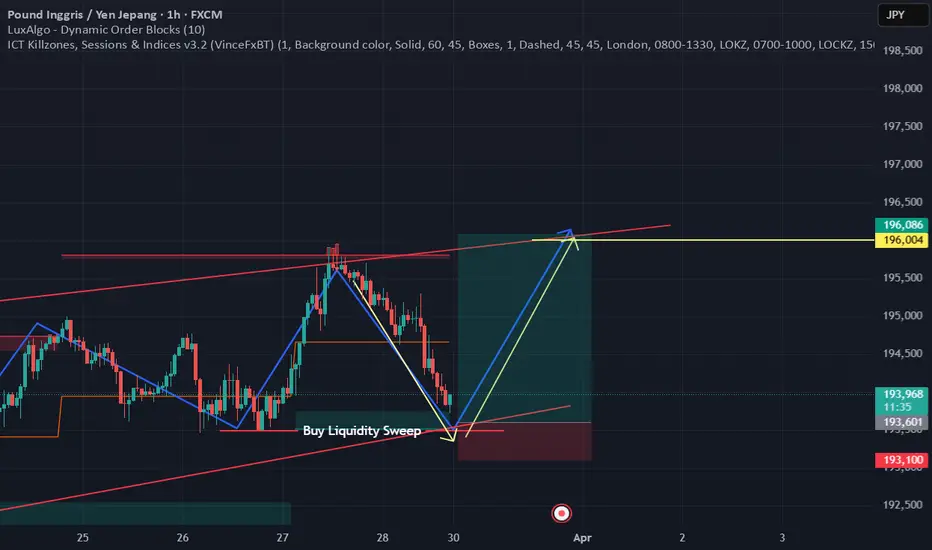 GBP/JPY berpotensi mengalami kenaikan, tetapi terlebih dahulu harus melewati area likuiditas yang cukup kuat di sekitar harga 193,489. Jika harga berhasil menembus area tersebut dan muncul sinyal reversal di time frame yang lebih kecil, maka ada kemungkinan pasangan mata uang ini akan melanjutkan tren bullish utamanya hingga mencapai kisaran 196,00.