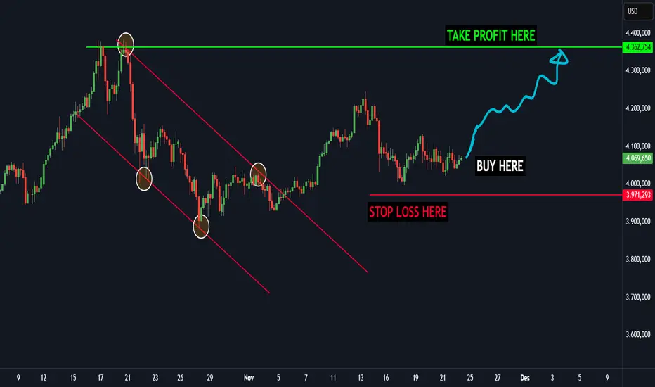 XAUUSD (EMAS) baru-baru ini mengalami tren turun jangka pendek selama beberapa minggu, tetapi kini telah menunjukkan beberapa pergerakan bullish yang jelas. XAUUSD (Emas) telah menembus kanal tren turun yang bertindak sebagai resistance kuat. Harga kemungkinan besar akan menuju level resistance kuat berikutnya yang ditandai sebagai zona take profit (garis hijau). Saatnya membeli!