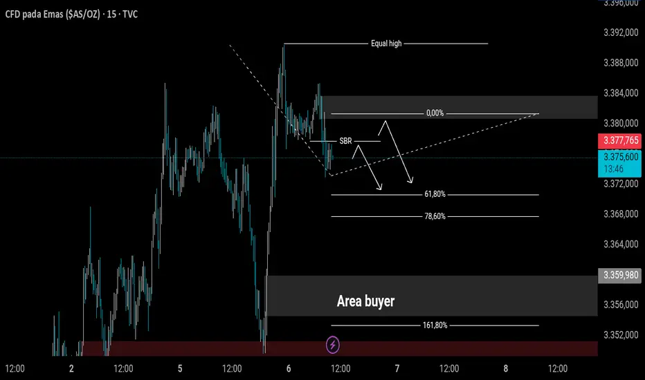 Analisis dilakukan di TF M15 pada pair GOLD, dengan fokus pada struktur bearish setelah terbentuk Equal High yang mengindikasikan potensi distribusi.