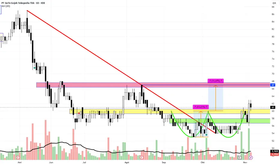 Pasca breakout pola double bottom-nya, saham GOTO saat ini sedang melakukan testing support area 59 – 60. Jika kondisi tersebut bertahan dan berada diatas support kuat area 57, maka berpeluang ke area TP teroritis di area 67. Batasi resiko jika turun di bawah support area hijau 57.