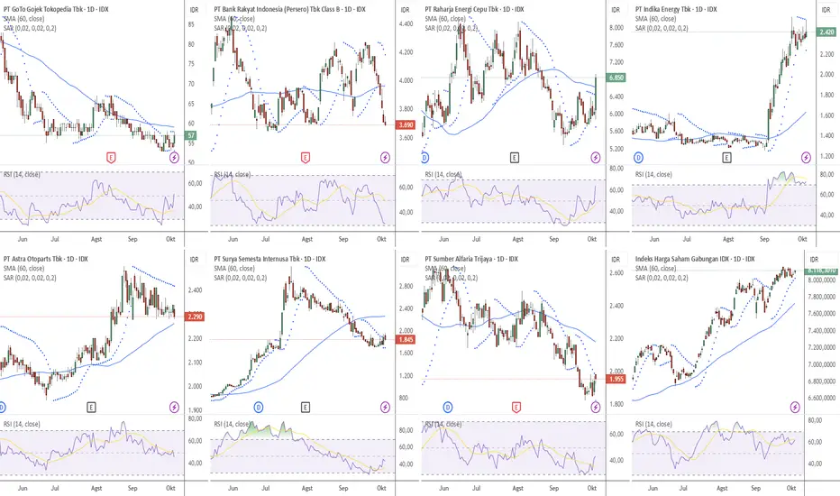 Saham dengan sinyal Buy dari Parabolic SAR : GOTO, RATU, INDY dan AMRT serta (SSIA yang masih fresh Buy signal).
