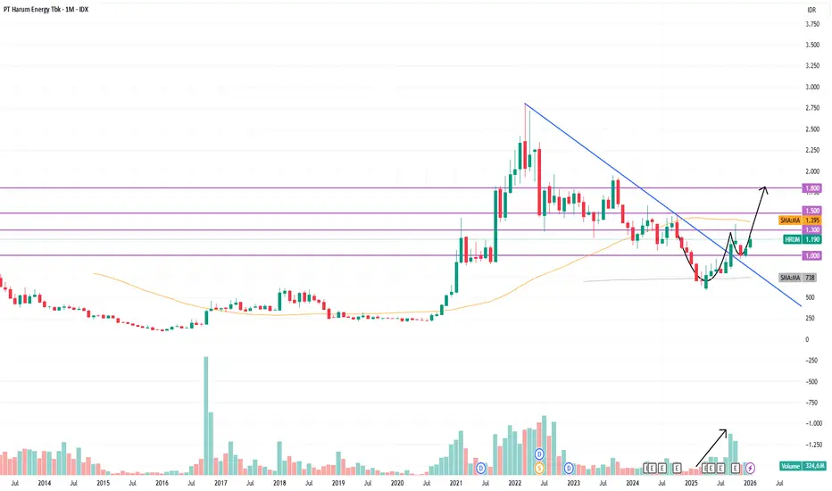 HRUM sudah patah trend dari Down Trend menjadi Sideways/Up trend. terlihat dari garis trendline warna bira pada chart monthly yang sudah ditembus oleh harga.