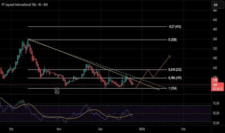 LAPD Masih dalam fase akumulasi (Sideways) pada rentang harga Rp155 - Rp200 , yang mana megindikasikan belum adanya tanda - tanda kenaikan. Area Entry berdasarkan Fibonacci Retratcement (0.786) atau pada area resistance trendline (garis Kuning) pada harga Rp190-Rp200, atau bisa pada area fibonacci ( 1 ), gunakan area fibo ( 1 ) tersebut untuk konfirmasi apakah harga akan mengalami breakout (kebawah) atau fake out ( turun bawah sedikit) untuk berbalik arah ke atas melakukan reversal menjadi Up Trend.