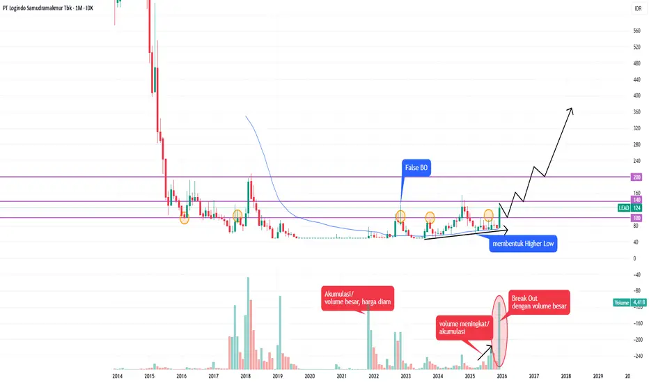 Saham LEAD bangun dari tidur panjangnya, terlihat dari chart Monthly sepanjang rentang waktu dari 2015 sampai saat ini (2025), ditandai dengan harga mencoba menembus level resisten di 100.