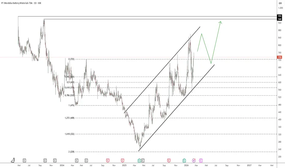 MBMA dalam Uptrend Channel sejak Maret 2025 dengan potensi menguji Resistance dari All Time High di Rp940 - Rp955.
