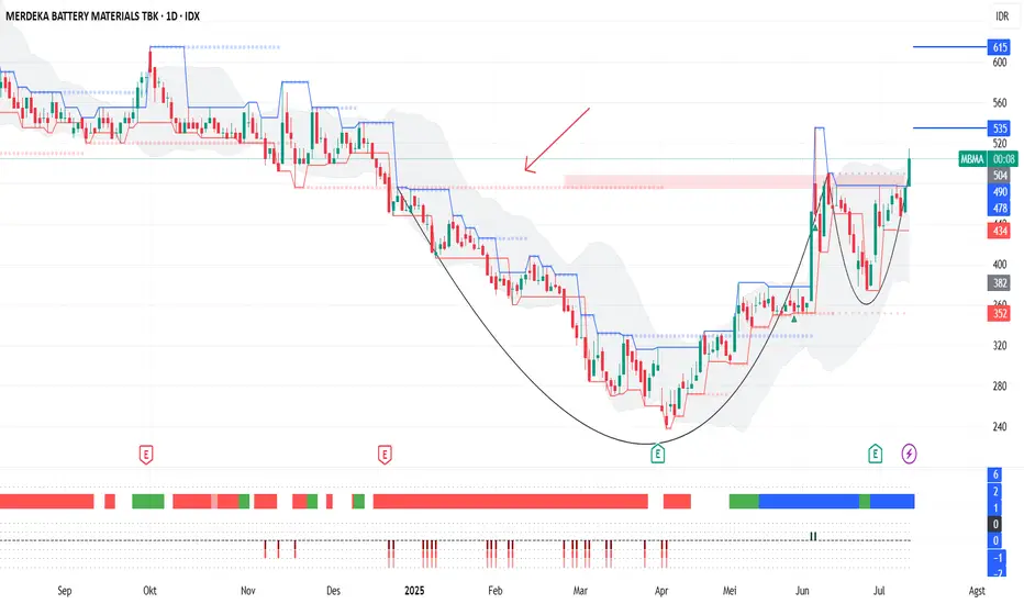 MBMA berhasil break resisten 478 sekaligus neckline dari pola cup & handle. Pola tersebut terbentuk setelah sebelumnya MBMA gagal melewati area swing high 476 dan berkonsolidasi di sekitar area tersebut dengan membentuk support yang lebih tinggi.