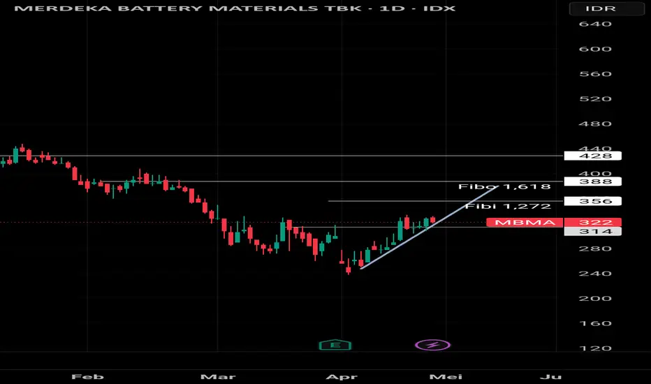 MBMA sepertinya mulai masuk uptrend untuk jangka pendek. Selama MBMA bisa bertahan di atas 300 ada potensi MBMA ke 388.