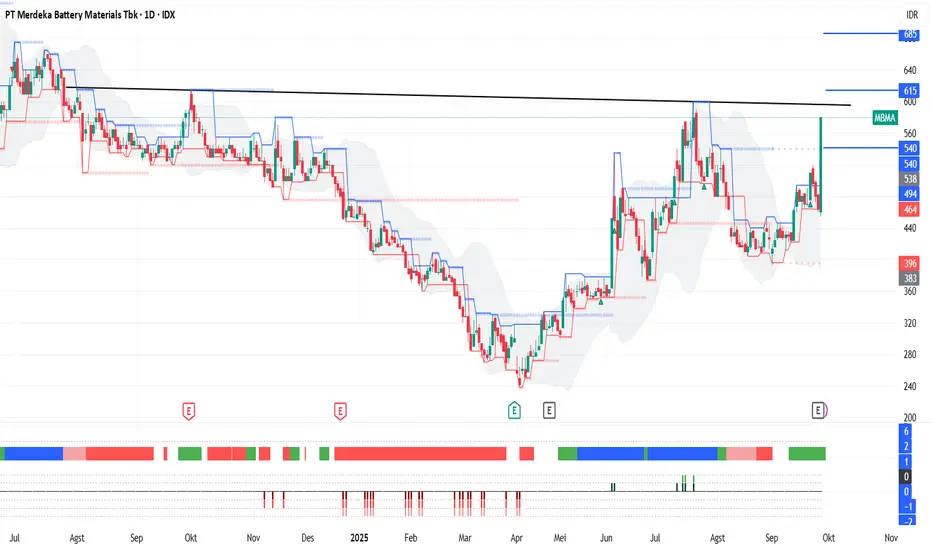 Sesuai dengan ulasan MBMA sebelumnya: 'MBMA: Masih Ada Potensi Menuju 615, Cermati' saham ini berhasil melampaui target minor kami di 540 bahkan terus bergerak naik menuju target major kami di 615. Selama pergerakan MBMA mampu bertahan di atas area target 540, maka masih ada peluang bagi MBMA untuk bergerak naik lebih tinggi menuju 685 dengan minor target di 615.