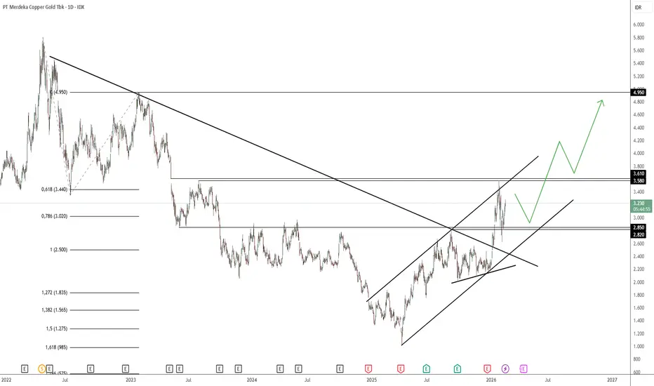 MDKA mengakhiri Downtrend setelah Breakout Down Trendline di level Rp2,500 pada awal tahun 2026.