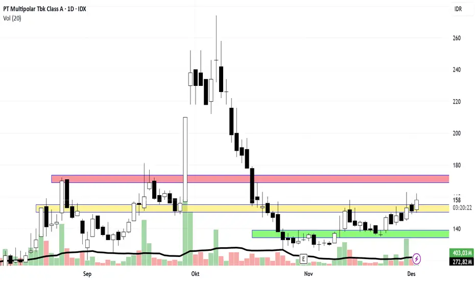 Saham MLPL terlihat sedang melakukan testing resisten area kuning sekitar 155, jika bisa berlanjut maka akan naik lagui ke area merah sekitar 172. Jika tidak berhasil, maka akan turun ke area hijau sekitar 137.