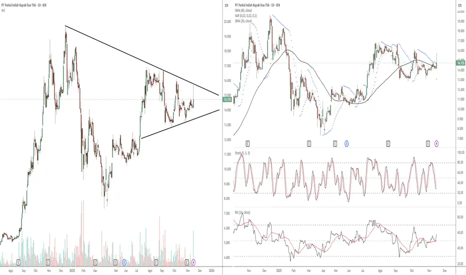 Volume yang tinggi menjanjikan potensi Breakout Rp15,750. Perlu diwaspadai penurunan di bawah Rp13,000.