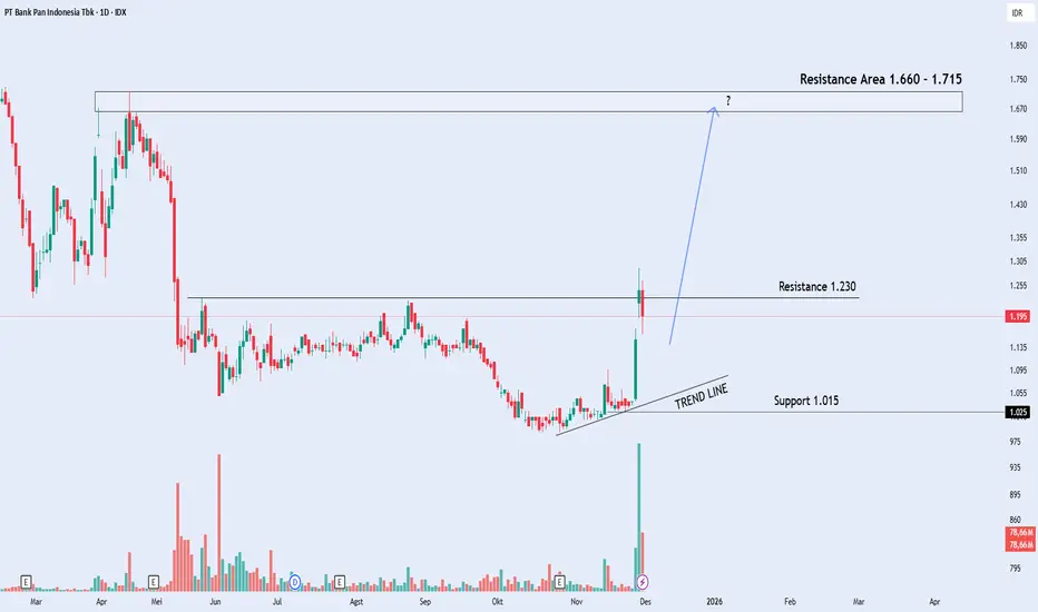 PNBN setelah mengalamai Breakout dari 1.230 pengalami restest untuk menutup GAP yg ada dan berpotensi lanjut rally di Resistance Area nya di 1.660
