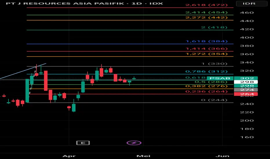 PSAB mantul di fibo 0,5 pada harga 286. Saat tulisan ini di buat PSAB sudah naik diatas fibo 0,618 di harga 298. Jika di lihat formasi candlenya PSAB sudah mulai mencoba uptrend. Jika PSAB bisa breakout dari harga 330, PSAB berpotensi ke 354.