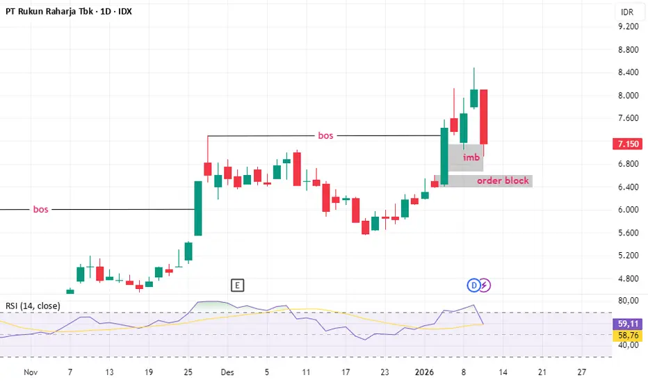 RAJA mengalami koreksi cukup tajam. Namun jika melihat chart di H1, RAJA berada di garis support kuat, apalagi garis ini berada di area golden rasio fibonachi. Kita bisa melakukan spekulasi buy di harga tersebut, , atau menunggu harga turun hingga ke area order block, sembari menunggu candle konfirmasi untuk melakukan pembelian