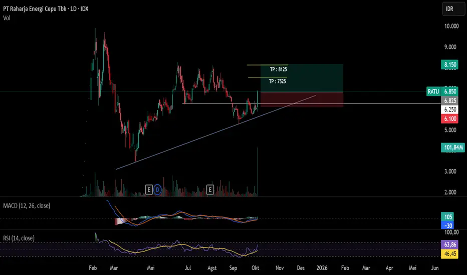 RATU masih dalam trend naik jangka menengah. Saat ini RATU mantul dari garis trendline. Jika RATU bisa breakout ke atas 6900 disertai volume, RATU berpeluang naik ke 7500.