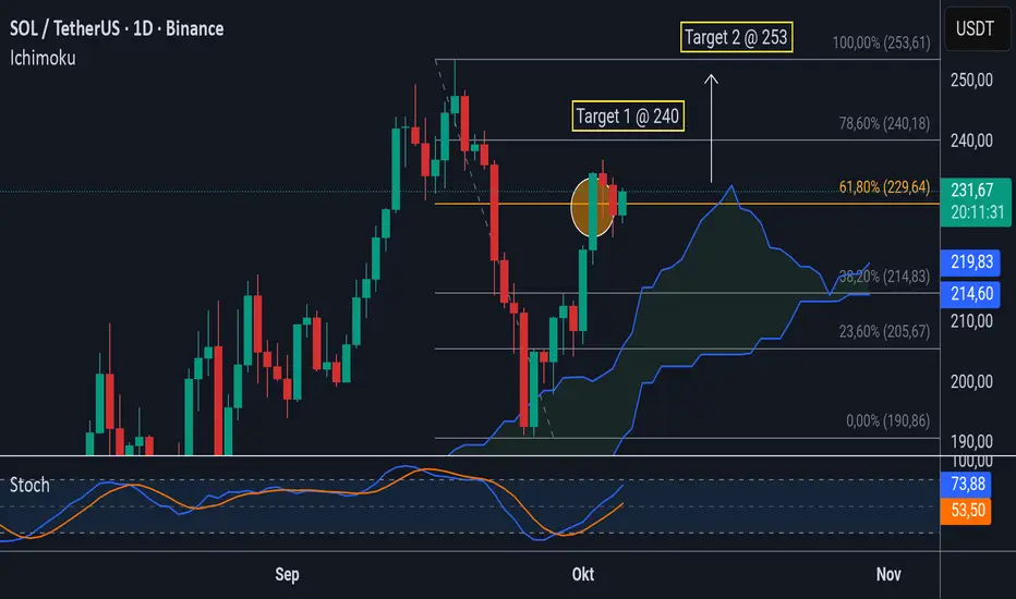 Harga Solana (SOL) saat ini bergerak di sekitar 230 USDT dan berhasil bertahan di atas **level Fibonacci 61,8% (229,6)** — sinyal positif bahwa tren naik masih berlanjut.