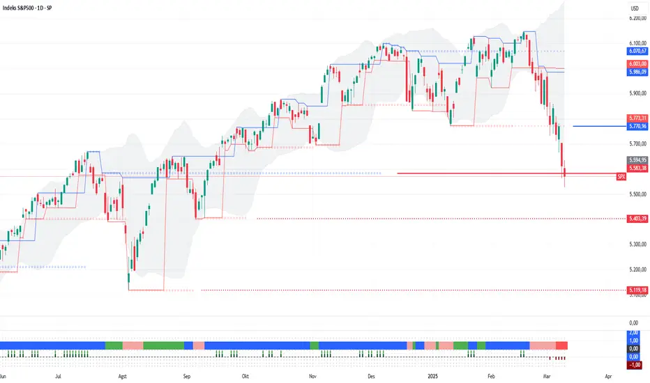 Jika kamu perhatikan menggunakan indikator Profit Trader Module, penurunan indeks S&P500 ini sudah mencapai area swing low 5583. Area ini menjadi level support kuat S&P500 selanjutnya. Ga heran kan, kalo penurunannya tertahan area ini.