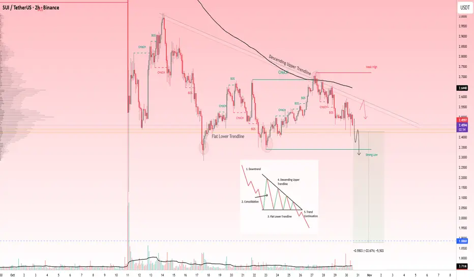 SUIUSDT is forming a clean descending triangle pattern, showing consistent lower highs and strong bearish pressure building near the flat lower trendline. This structure suggests sellers are gradually gaining control as buyers continue to lose momentum.
