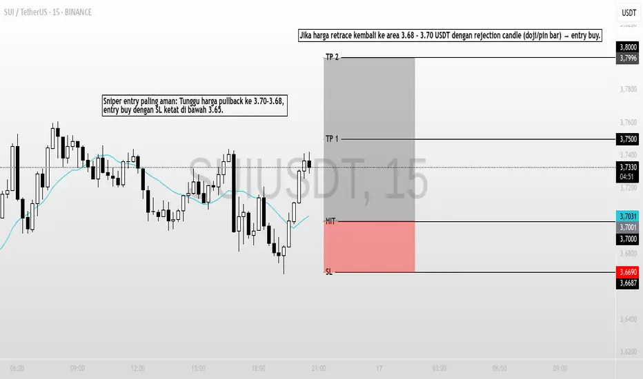 👉 Kesimpulan: Market SUI/USDT sedang dalam fase early reversal. Sniper entry terbaik saat ini adalah buy di area 3.68–3.70 dengan konfirmasi candlestick, target 3.75–3.80, SL di bawah 3.65.