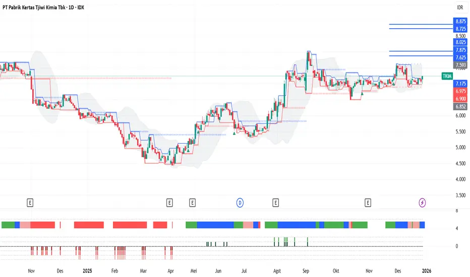 TKIM saat ini sedang berkonsolidasi sehat dan berada di area resisten fractalnya di 7175. Cermati juga level support 6975. Selama TKIM mampu bertahan di atas area ini, tentu ada potensi bagi saham ini untuk melanjutkan tren kenaikan yang lebih tinggi lagi menuju 8725 - 8875 dengan minor target di 7875 - 8025.