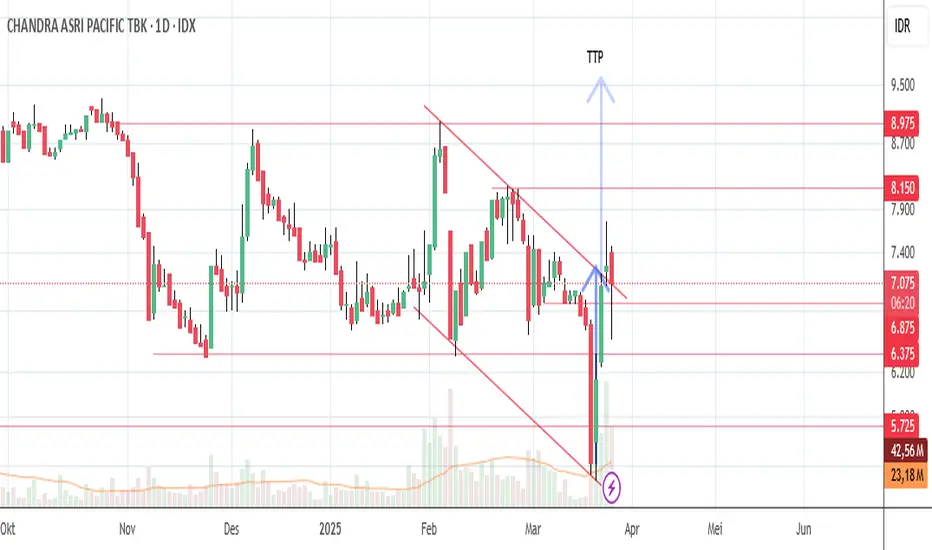 Saham TPIA reject terhadap trendline pola sejak Jan25, yang sudah ditembus. Beberapa golden cross juga terlihat di MACD dan Stochastic. Selama bertahan di atas 6.875, maka potensi menuju TTP di sekitar 9.400, masih valid.