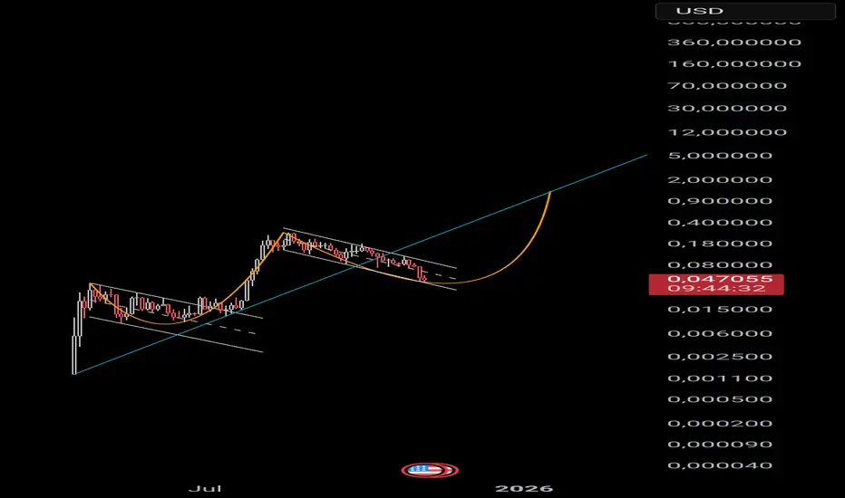 📈 Proyeksi (garis oranye): potensi reversal dari dasar channel menuju breakout besar ke atas, menembus garis trend biru — jika valid, bisa membuka momentum ke area 0.2 – 0.8 USD dalam jangka menengah.