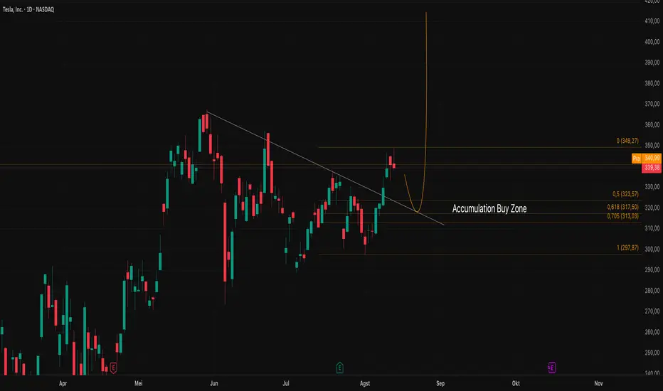 Secara teknikal, saham TSLA telah menunjukkan tren naik yang kuat, tetapi baru-baru ini mengalami koreksi setelah rally yang signifikan. Harga saat ini berada di dekat zona akumulasi yang ditandai oleh level Fibonacci retracement kunci dari kenaikan terakhir. Jika harga terkoreksi ke zona ini, ini bisa menjadi peluang beli yang menarik. Selama harga bertahan di atas support penting $297.87, potensi kelanjutan tren naik sangat besar.