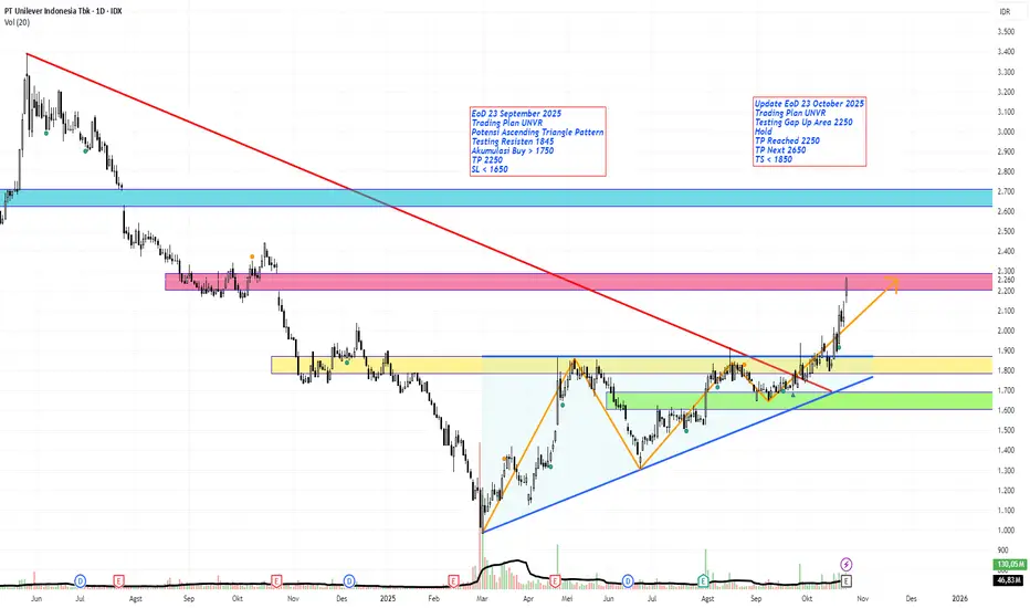Pada perdagangan hari ini, terlihat bahwa UNVR sukses breakout ascending triangle pattern; dan saat ini akan menguji gap up area 2250 yang menjadi resisten kuatnya saat ini, jika berlanjut maka akan menguji resisten gap up berikutnya di area 2650, naikkan trailling stop ke 1850.