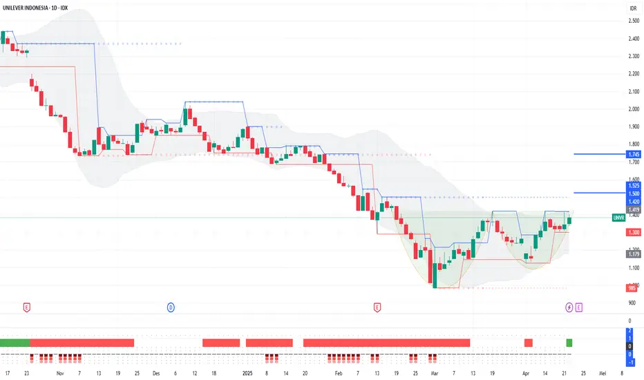 Jika UNVR mampu mengkonfirmasi pola Cup & Handle, UNVR berpotensi naik lebih tinggi lagi menuju level 1745 dengan target minor di level 1525. Trend optimizer yang menunjukkan perubahan warna dari merah panjang ke putih menandakan UNVR berada dalam fase bottom reversal.