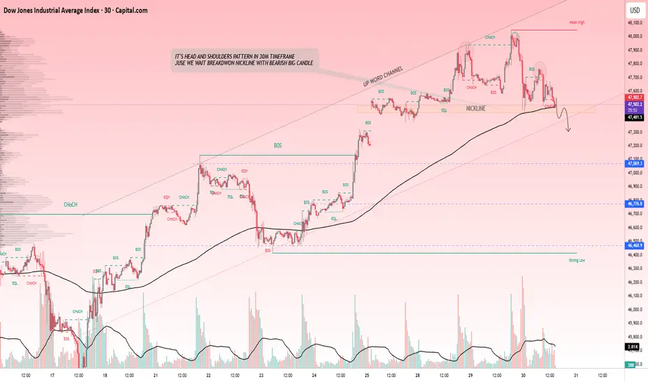US30 is forming a clear Head and Shoulders pattern on the 30-minute timeframe, indicating a potential shift from bullish to bearish momentum. The structure shows exhaustion at the highs, and price is now approaching the neckline zone.