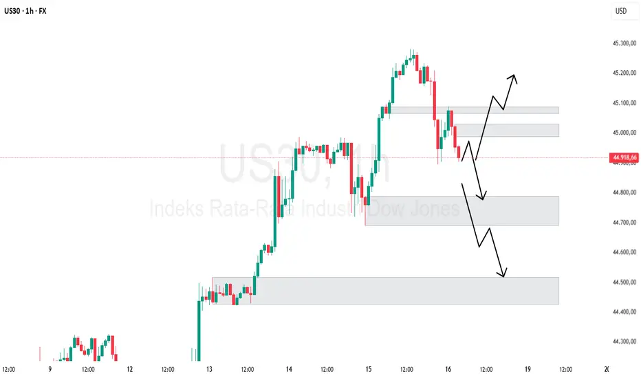 Harga US30 saat ini berada di sekitar 44.900 – 45.000. Terlihat adanya area supply di atas harga, serta area demand di bawah yang menjadi level kunci pergerakan selanjutnya.