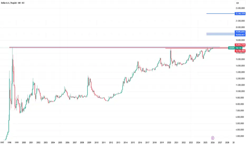 USDIDR saat ini sedang berkonsolidasi di area resisten kuatnya di area 16728 - 16854 (box biru) yang merupakan all time high sejak tahun1998. Tentunya, ini merupakan titik kritikal buat IDR kedepannya. Jika USDIDR mampu menguat dan bertahan di atas 16854, ada potensi USD terus menguat terhadap IDR dengan target kenaikan menuju 22160 dengan minor target di 18838 - 19092.