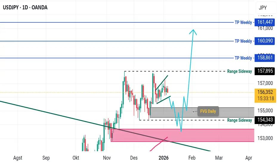 USDJPY berpotensi menunu area FVG pada Timeframe Daily dimana area FVG merupakan area "BUY" terbaik dengan target dikisaran level 158.861 hingga 161.447 yang merupakan target Weekly.