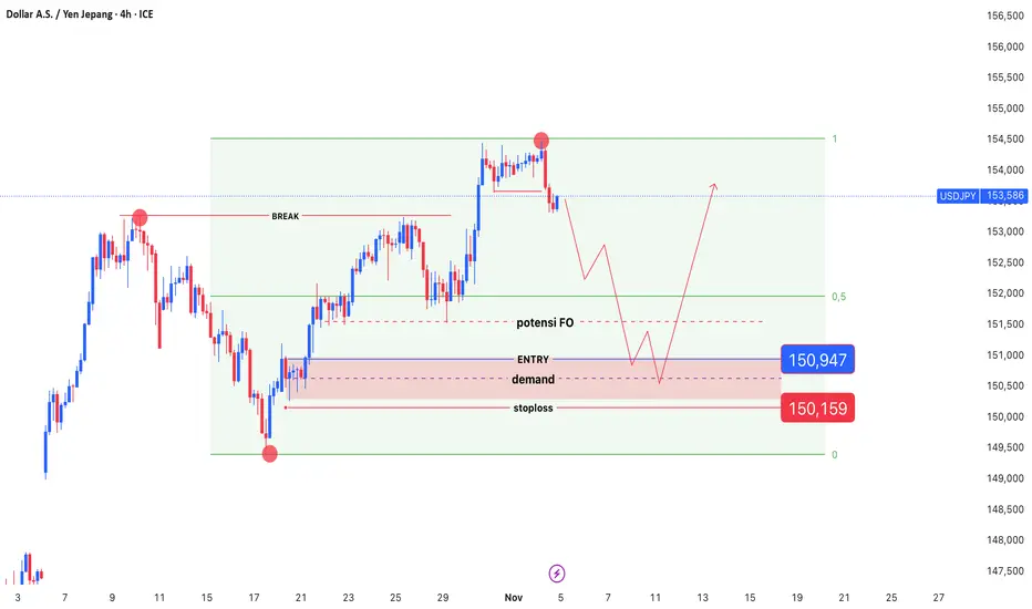 Setelah harga melakukan break of structure di area atas dan membentuk higher high, kini USDJPY menunjukkan tanda-tanda retracement menuju area demand zone di sekitar level 150.947 – 150.159.