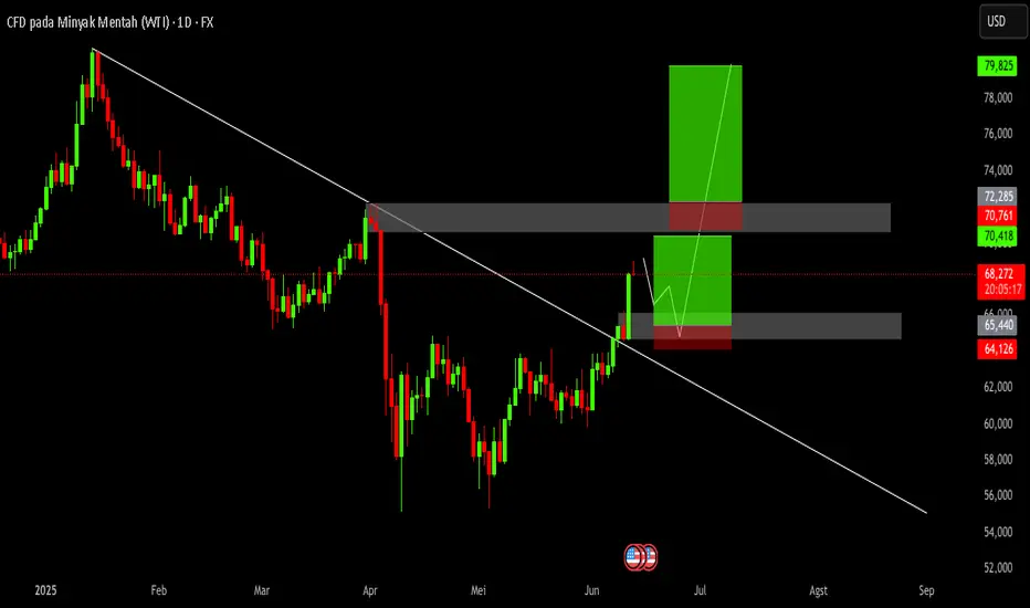 Harga minyak mentah (WTI) menunjukkan sinyal kuat pembalikan arah setelah berhasil breakout dari garis trendline turun jangka menengah. Saat ini harga diperdagangkan di sekitar $68.27, dengan struktur pasar yang mendukung potensi kenaikan lanjutan.