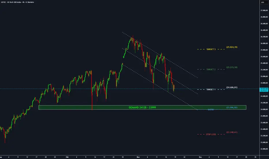 USTEC saat ini masih dalam kondisi Bearish dan berpotensi masuk area Demand 24.128 - 23.999. Kalian bisa ambil posisi Buy ketika masuk area Demand dan market Bisa Berpotensi Naik Hingga 25.800 dan ini sangat bagus karena koreksi yang terjadi adalah bentuk dari koreksi sehat yang bisa membuat Ustec naik lebih tinggi. Buy And Hold adalah strategy Terbaik dalam Melakukan Trading Index/Saham.