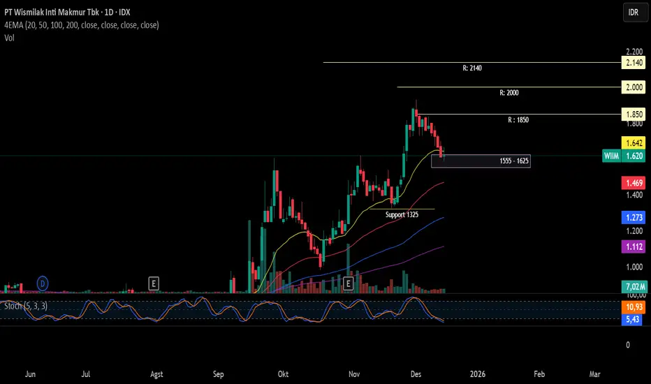 WIIM secara trend masih uptrend dan saat ini posisinya sedang berada di area retracement 1555 - 1625. Harga saat ini masih di atas EMA 20, 50, 100 & 200 ini menandakan up trend masih kuat. Stochastic sudah di area oversold jadi peluang teknikal rebound tinggi.