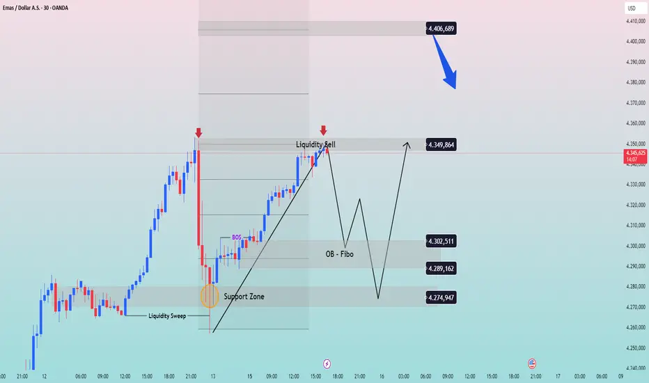 Harga menyapu sell liquidity di 4.349–4.350 namun gagal bertahan, menandakan pelemahan di premium. Setelah sweep bawah dan BOS bullish, pergerakan saat ini adalah fase rebalancing.