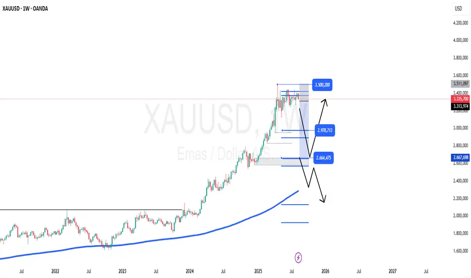 Harga emas saat ini masih tertahan di area resisten 3.400 – 3.500 setelah rally panjang sejak 2023.