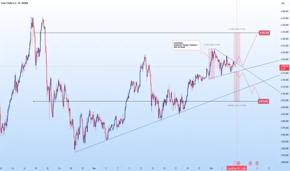 Emas saat ini masih berada dalam fase konsolidasi yang membentuk symmetrical triangle, menandakan pasar masih mencari arah. Struktur ini biasanya bersifat bilateral, sehingga arah selanjutnya akan sangat ditentukan oleh breakout dari pola ini.